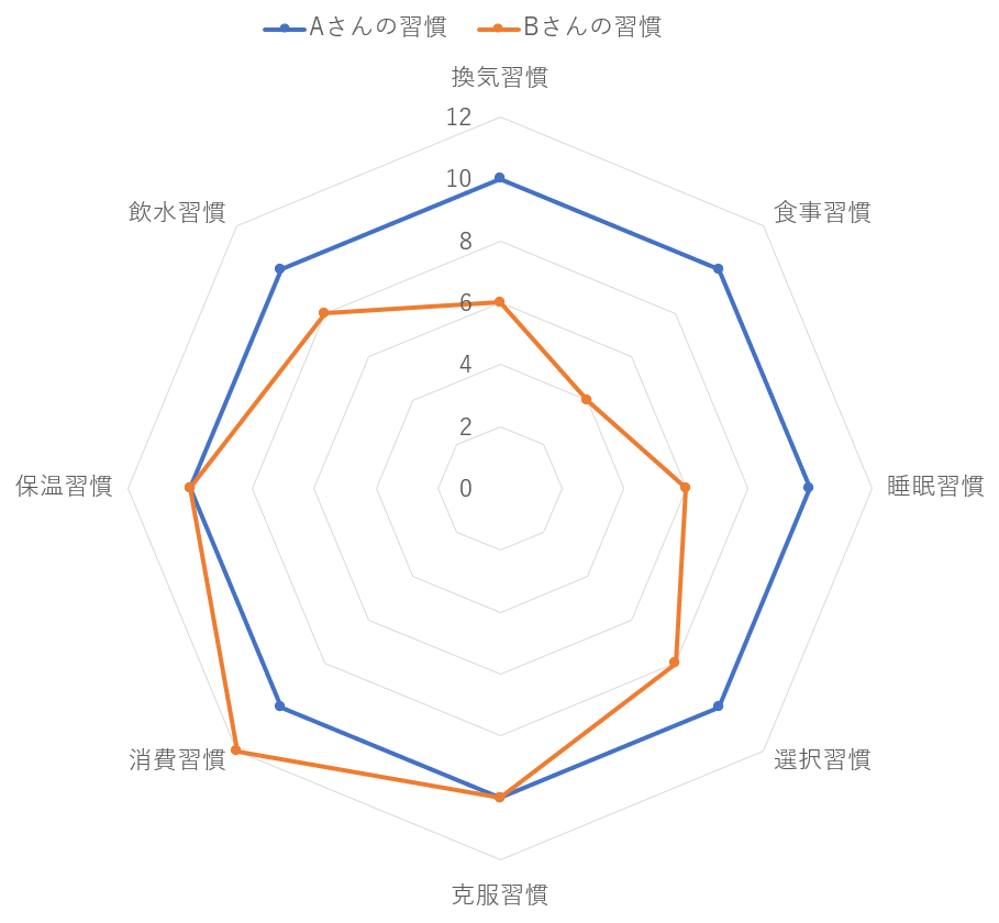 レーダーグラフのAさんは8つ全ての習慣で10点分稼いでおり、合計80点になりました。